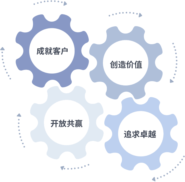 成就客户是一切决策的出发点,,,,创造价值是衡量所有工作的标准,,,,追求卓越是我们做事做人的态度,,开放共赢是我们的格局也是最终的结果。。。。价值观的齿轮环环相扣,,,,推动着组织里的每个人不断向前。。。