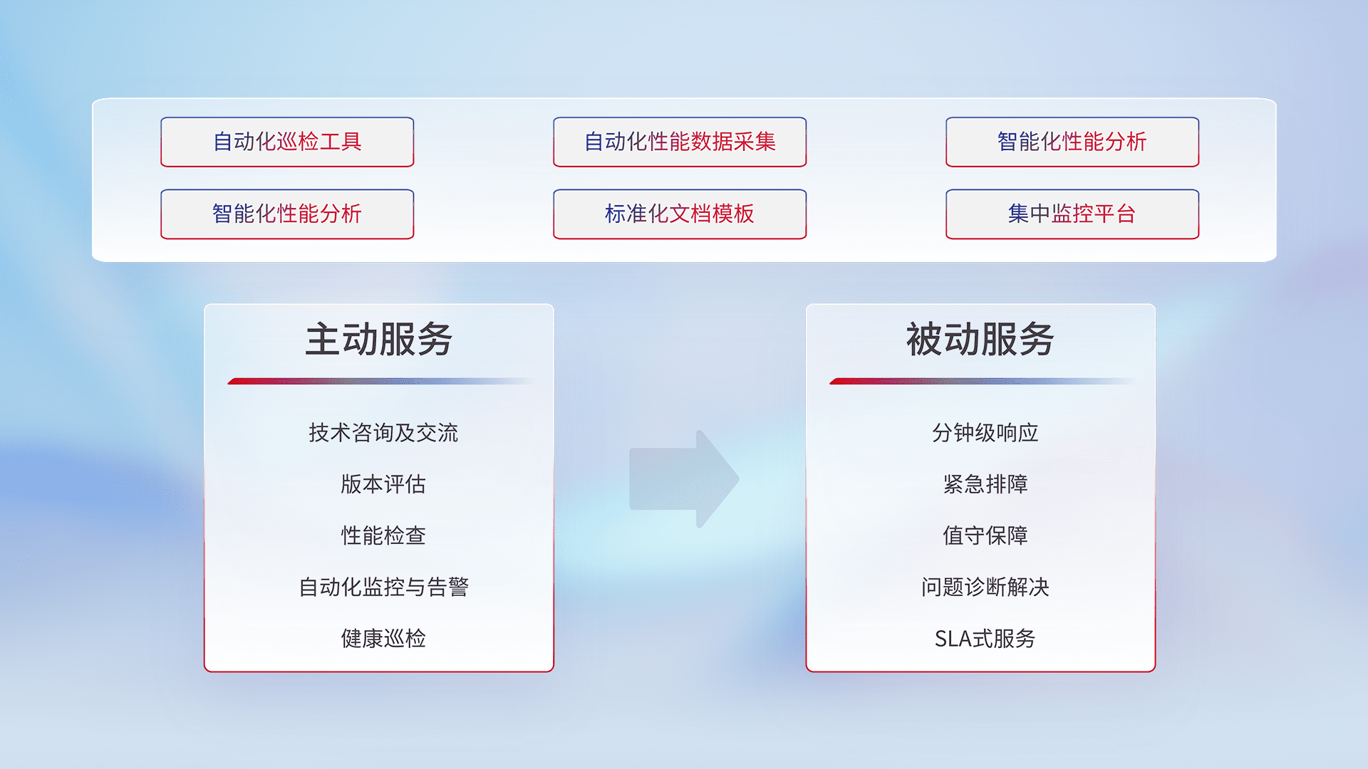 智能化工具和标准化文档,,保障服务质量,,提供主动服务(包含技术咨询、、版本评估、、、性能检查、、、、自动化监控与告警、、、、健康巡检)和被动服务包含(分钟级响应、、、、紧急排障、、、、值守保障、、、问题诊断解决、、、SLA服务)。。